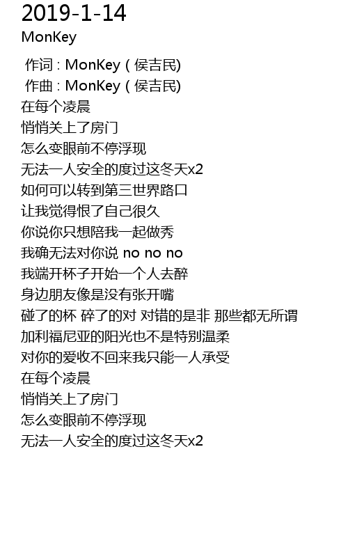 | [00:00.000] | 作词 : MonKey(侯吉民) |