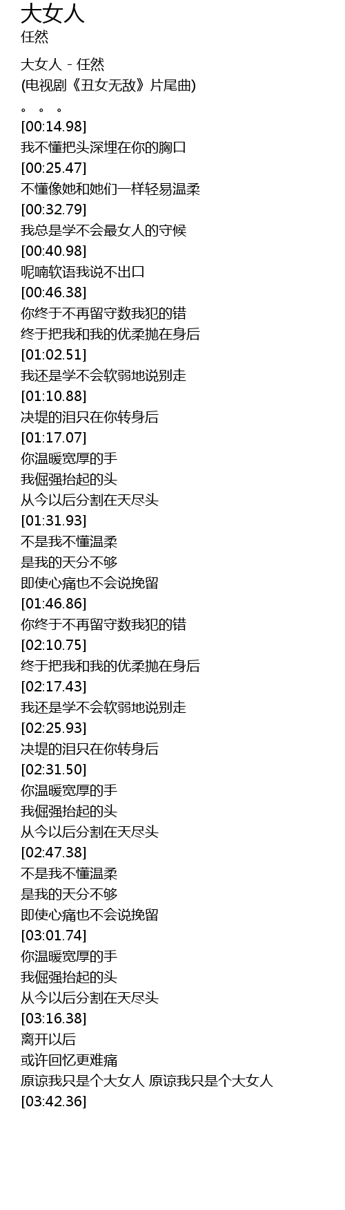 | [03:26.60] | 原谅我只是个大女人 原谅我只是个大女人 |