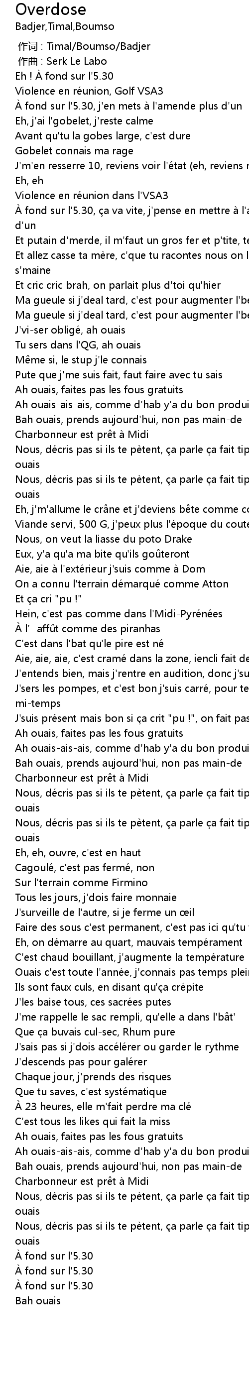| [00:22.56] | À fond sur l' 5. 30, a va vite, j' pense en mettre a l' amende plus d' un |