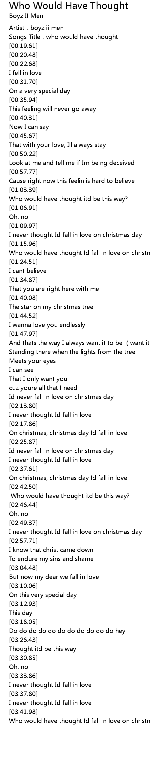 | [03:43.36] | Who would have thought Id fall in love on christmas day? |