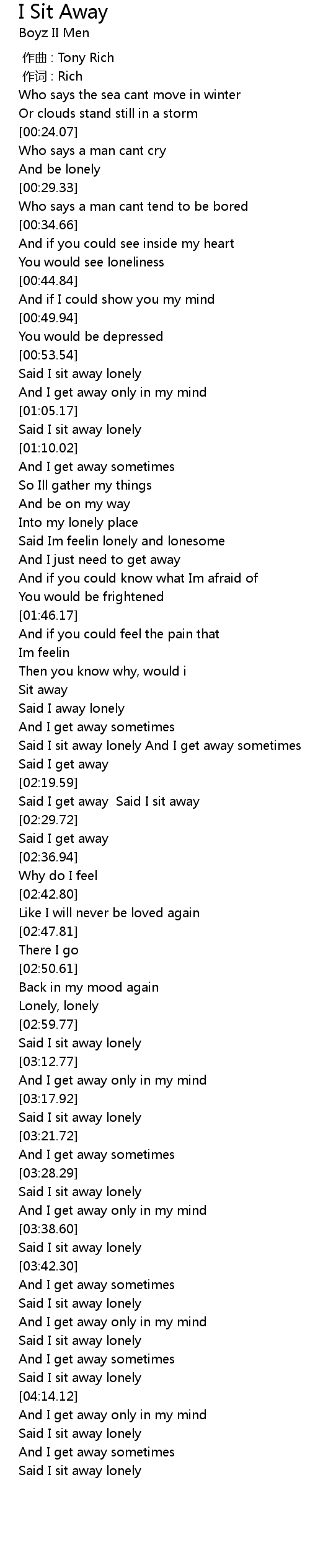 | [04:30.38] | Said I sit away lonely |