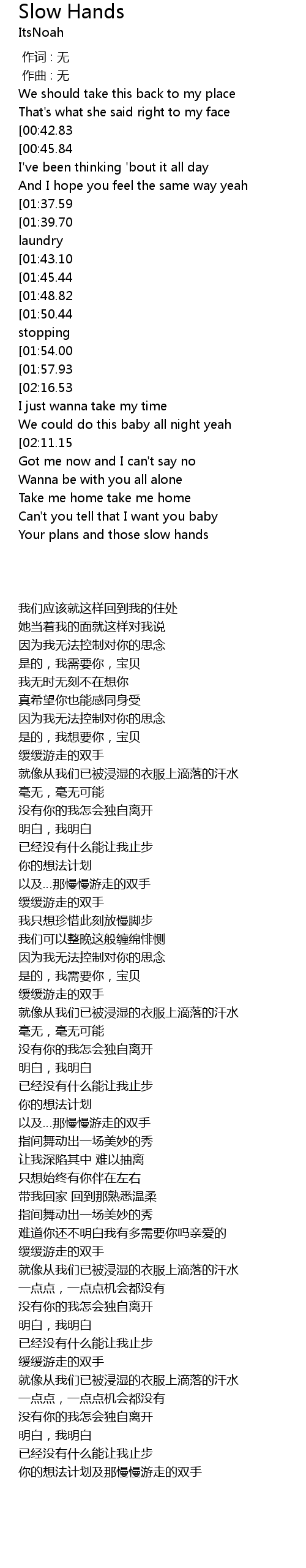 | [01:15.13][02:16.53][02:32.74] | Slow hands |