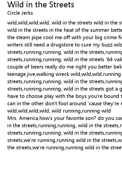 wild,wild,wild,wild, wild in the streets wild in the streets wild in the streets wild in the streets in the heat of the summer better call out a plumber turn on the steam pipe cool me off with your big crime fighters and your newspaper writers still need a drugstore to cure my buzz wild in the streets,running,running, wild in the streets,running,running, wild in the streets,running,running, wild in the streets '64 valiant,hand full of valiums couple of beers really do me right you better believe us,better trust us , teenage jive,walking wreck wild,wild,wild,running wild wild in the streets,running,running, wild in the streets,running,running, wild in the streets,running,running, wild in the streets got a gang called the wolves you have to choose play with the boys you're bound to lose a bottle in one hand a can in the other don't fool around 'cause they're real mean mothers wild,wild,wild,wild, wild running,running wild |