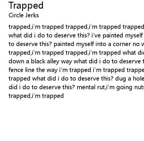 trapped,i'm trapped trapped,i'm trapped trapped,i'm trapped trapped,i'm trapped what did i do to deserve this? i've painted myself into a corner what did i do to deserve this? painted myself into a corner no windows,doors or a ladder trapped,i'm trapped trapped,i'm trapped what did i do to deserve this? running down a black alley way what did i do to deserve this? trash cans,chain link fence line the way i'm trapped i'm trapped trapped,i'm trapped trapped,i'm trapped what did i do to deserve this? dug a hole and there's nowhere to go what did i do to deserve this? mental rut,i'm going nuts! trapped,i'm trapped trapped,i'm trapped |