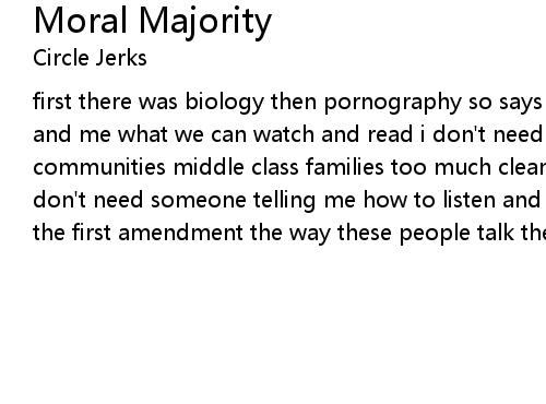 | first there was biology then pornography so says the moral majority telling you and me what we can watch and read i don't need some dumb schmuck telling me nice communities middle class families too much cleanliness too much stupidity i don't need someone telling me how to listen and how to read whatever happened to the first amendment the way these people talk they've never even heard it |