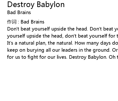 | Don' t beat yourself upside the head. Don' t beat yourself for this. Don' t beat yourself upside the head, don' t beat yourself for this. Oh, there is a way out. It' s a natural plan, the natural. How many days do we sit around, while they keep on burying all our leaders in the ground. Organize, centralize. It' s time for us to fight for our lives. Destroy Babylon. Oh there is a way. |
