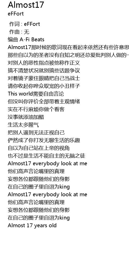 | [00:09.905] | Almost17那时候的歌词现在看起来依然还有些许意思 |