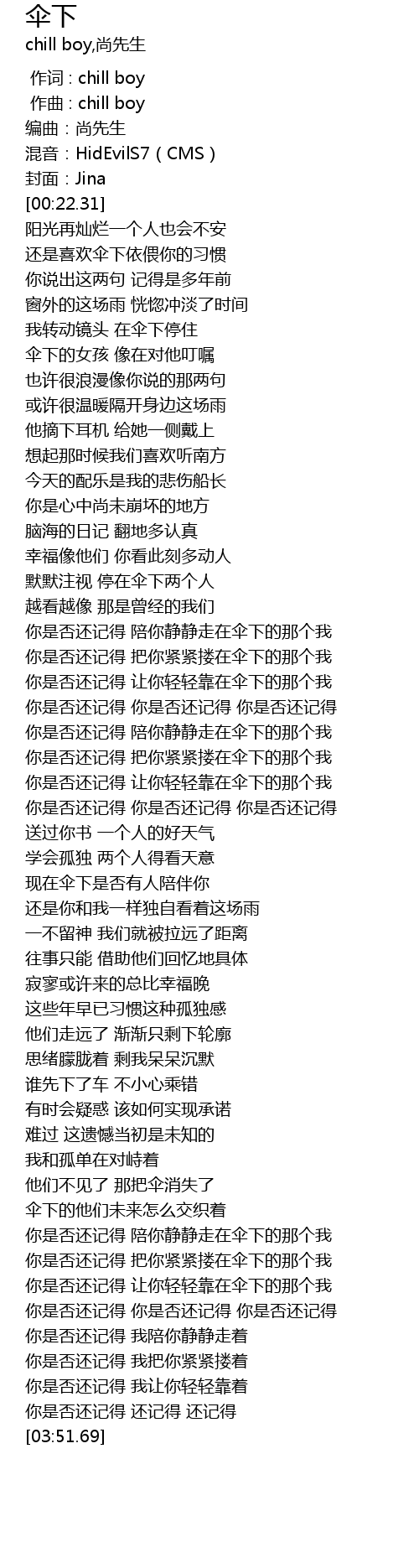 | [02:58.21] | 你是否还记得 陪你静静走在伞下的那个我 |