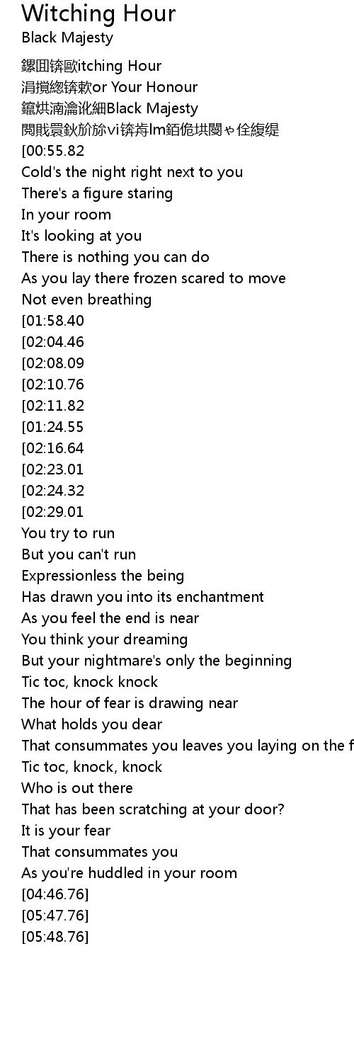 | [01:12.32][01:24.55][02:13.88][02:26.01][04:29.50][04:40.88] | In the witching hour |