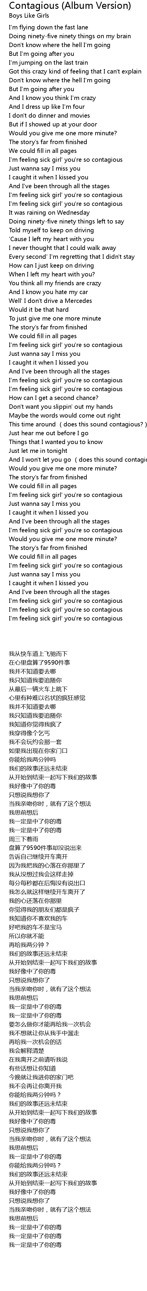 | [01:49.02] | I' m feeling sick girl' you' re so contagious |