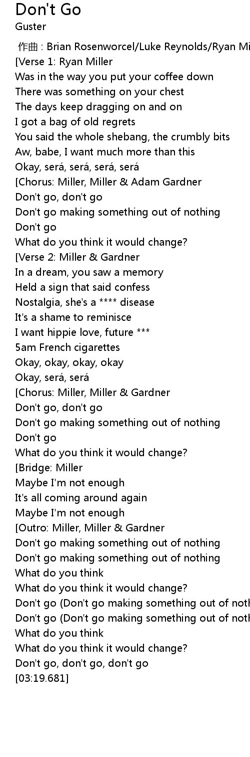 | [02:49.511] | Don' t go Don' t go making something out of nothing |