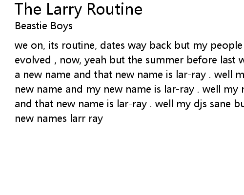 | we on, its routine, dates way back but my people may rember this routine but its evolved , now, yeah but the summer before last well my names mike dee and i got a new name and that new name is lar-ray . well my name is ad rock and i got a new name and my new name is lar-ray . well my name is mca but i got a new name and that new name is lar-ray . well my djs sane but it stays the same cause his new names larr ray |