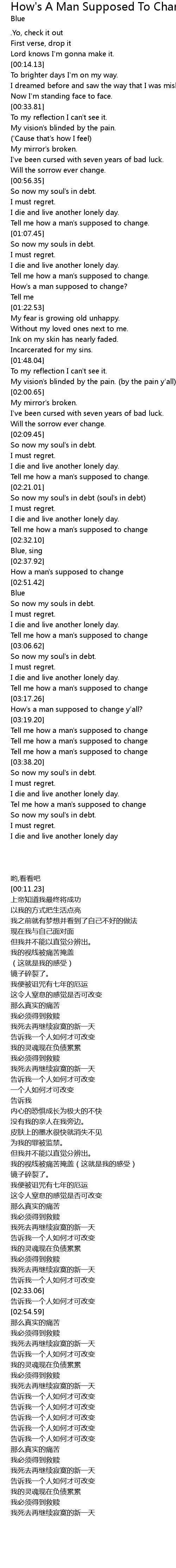 | [03:23.36] | Tell me how a man's supposed to change |