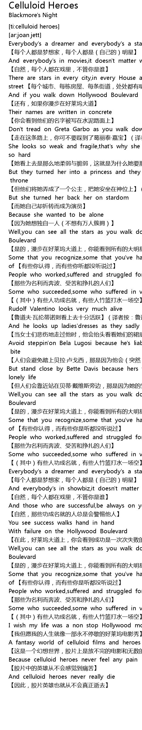 | [05:03.950] | Because celluloid heroes never feel any pain 【胶片中的英雄从不会感觉到痛苦】 |
