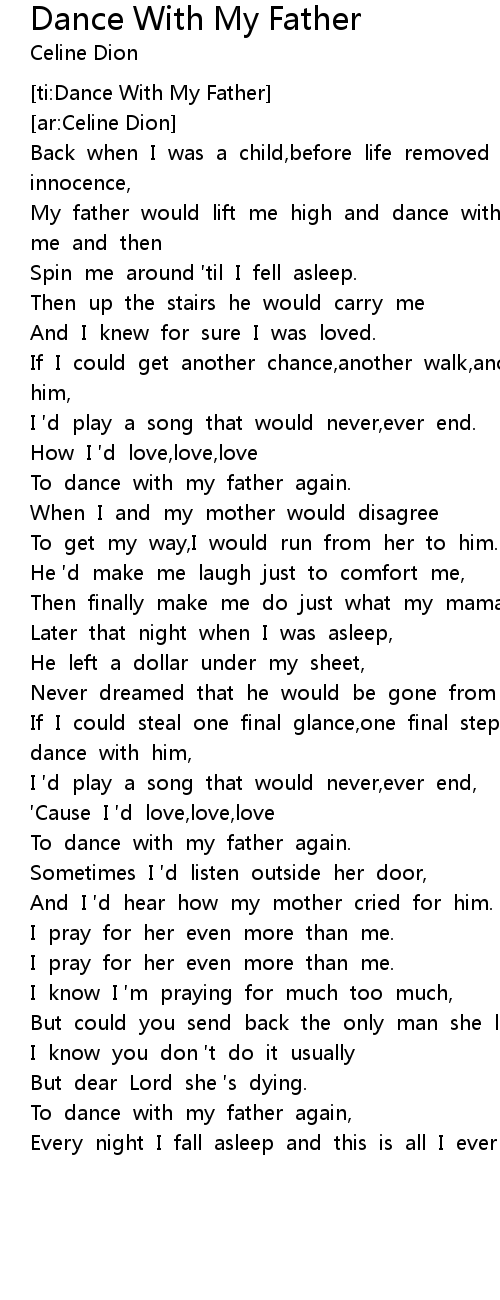 | [00:28.12] | My father would lift me high and dance with my mother and me and then |