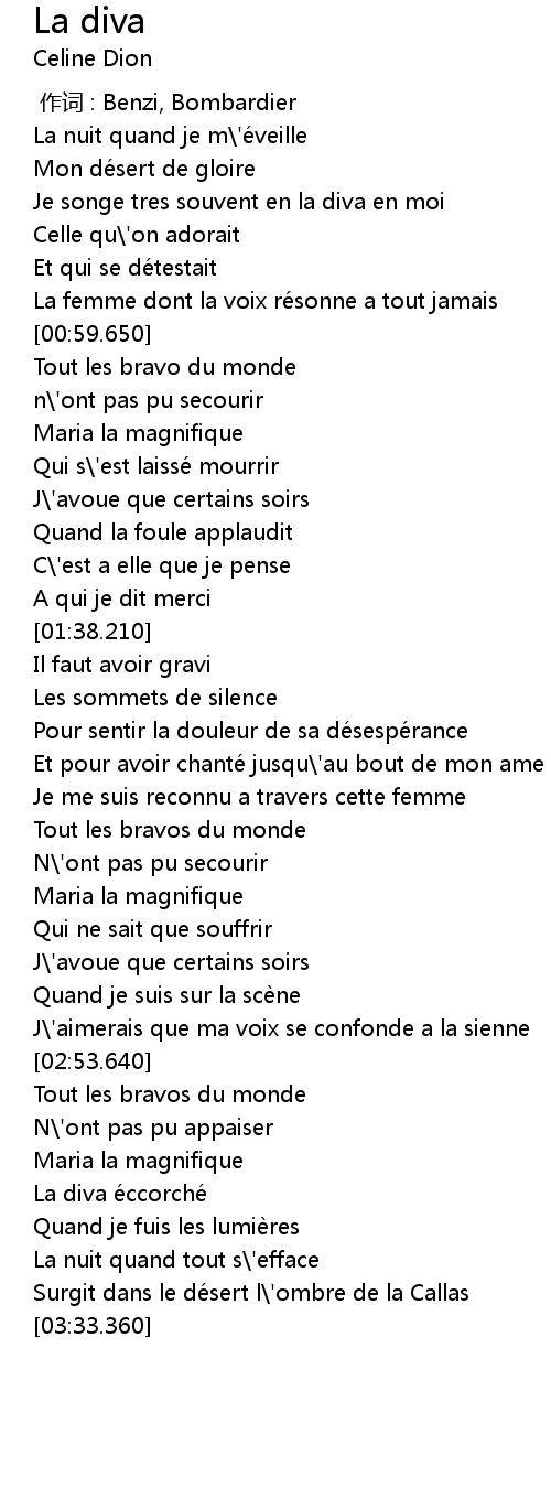| [00:33.590] | Je songe tres souvent en la diva en moi |