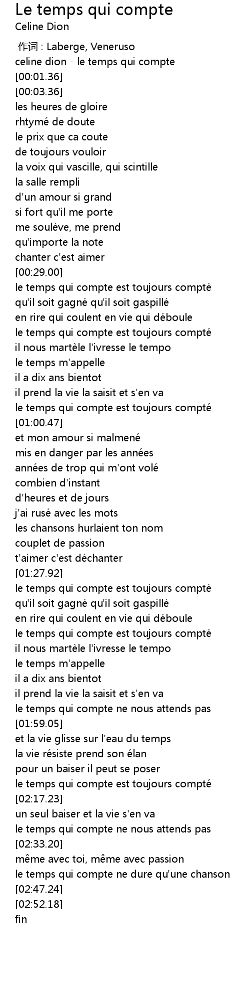 | [00:00.00] | celine dion - le temps qui compte |