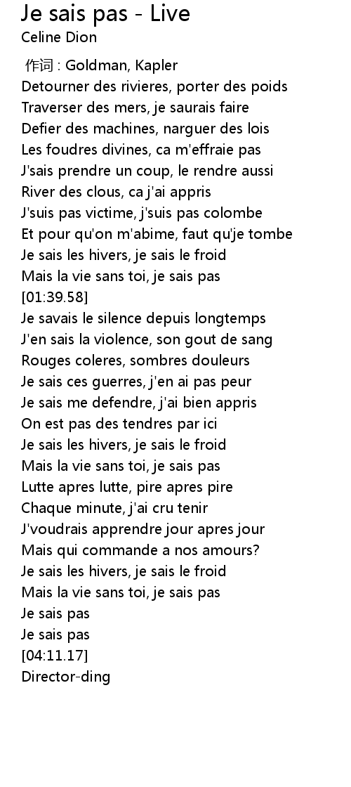 | [03:54.66] | Mais la vie sans toi, je sais pas |