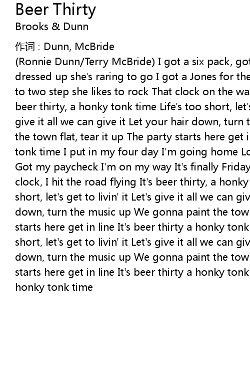 | (Ronnie Dunn/Terry McBride) I got a six pack, got a single stem rose My baby's dressed up she's raring to go I got a Jones for the moon and the jukebox I like to two step she likes to rock That clock on the wall it rings, it chimes It's beer thirty, a honky tonk time Life's too short, let's get to livin' it Let's give it all we can give it Let your hair down, turn the music up We gonna paint the town flat, tear it up The party starts here get in line Beer thirty a honky tonk time I put in my four day I'm going home Lord my get-up has got up and gone Got my paycheck I'm on my way It's finally Friday my kind of day I punch the clock, I hit the road flying It's beer thirty, a honky tonk time Yeah life's too short, let's get to livin' it Let's give it all we can give it Let your hair down, turn the music up We gonna paint the town flat, tear it up The party starts here get in line It's beer thirty a honky tonk time Yeah life's too short, let's get to livin' it Let's give it all we can give it Let your hair down, turn the music up We gonna paint the town flat, tear it up The party starts here get in line It's beer thirty a honky tonk time It's beer thirty a honky tonk time |