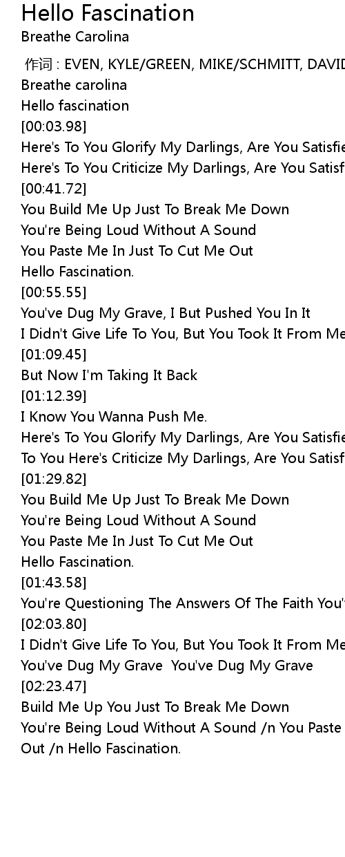 | [02:30.59] | You' re Being Loud Without A Sound n You Paste Me In Just To Cut Me Out n Hello Fascination. |