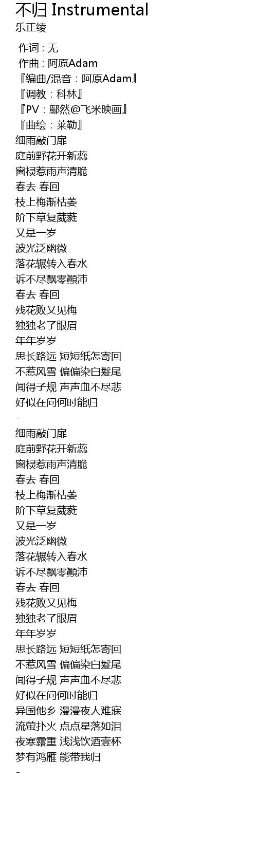 不归 Instrumental bu gui Instrumental Lyrics