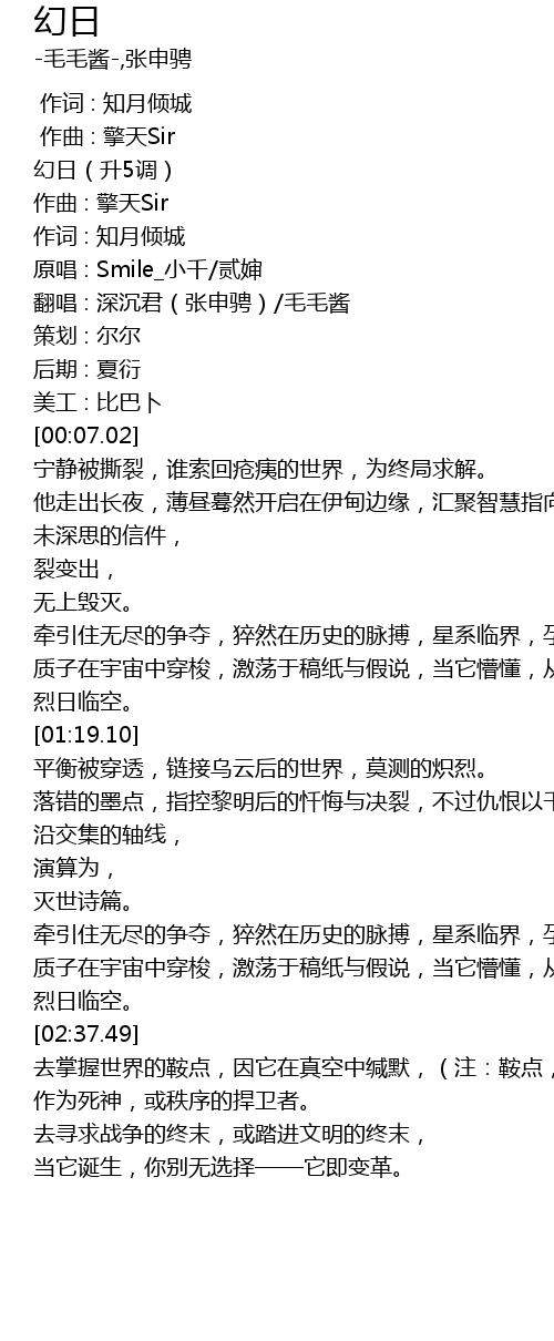 | [00:04.17] | 翻唱 : 深沉君(张申骋)/毛毛酱 |