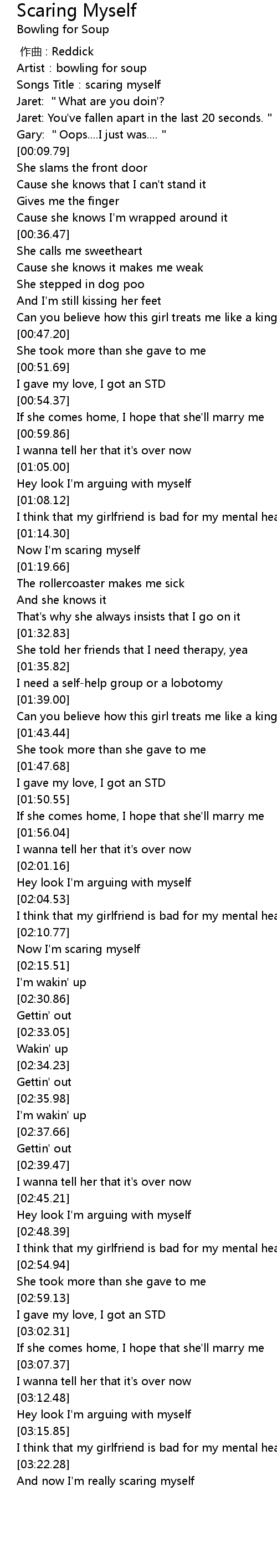 | [00:03.49] | Songs Title: scaring myself |