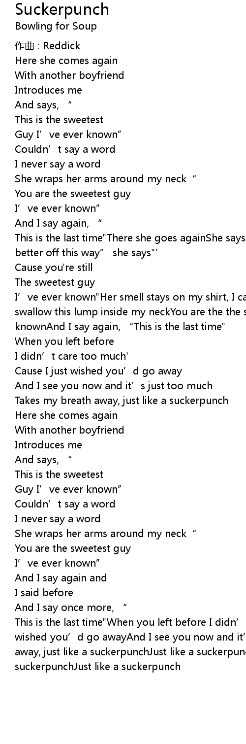 | This is the last time" When you left before I didn' t care too much' Cause I just wished you' d go awayAnd I see you now and it' s just too muchTakes my breath away, just like a suckerpunchJust like a suckerpunch, yeah, just like a suckerpunchJust like a suckerpunch |