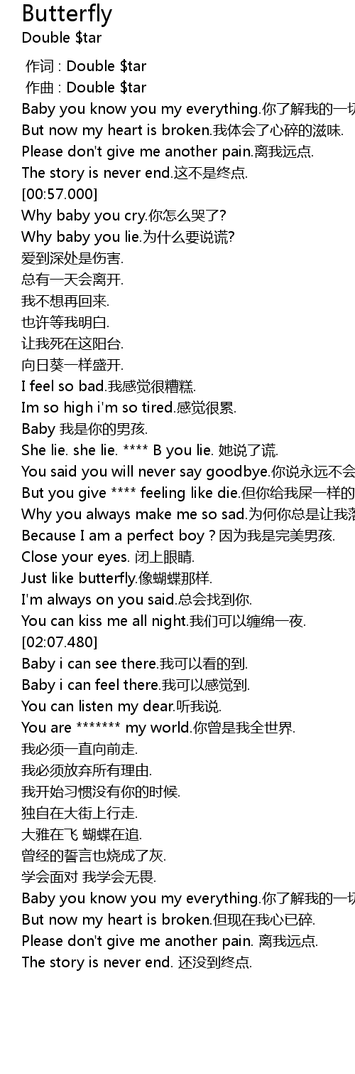 | [01:58.896] | Just like butterfly.像蝴蝶那样. |