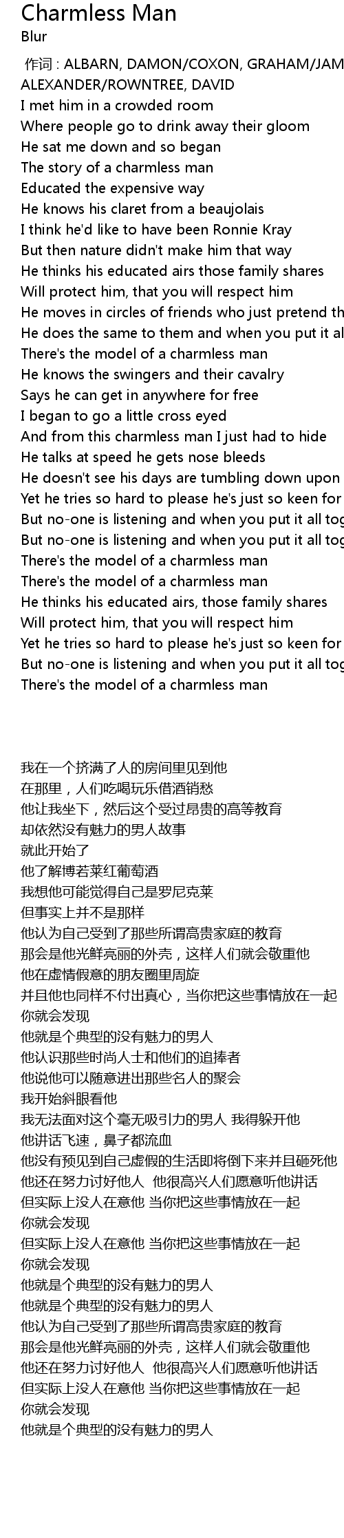 | [00:00.00] | 作词 : ALBARN, DAMON/COXON, GRAHAM/JAMES, STEVEN ALEXANDER/ROWNTREE, DAVID |