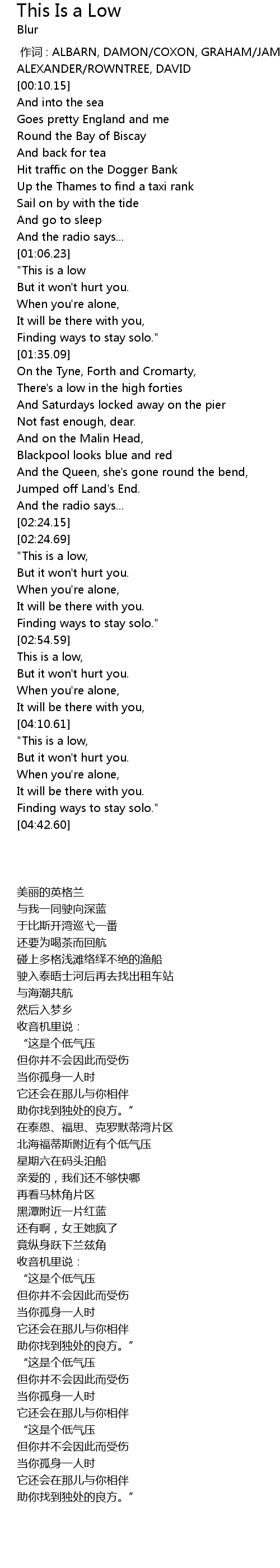 | [00:00.00] | 作词 : ALBARN, DAMON/COXON, GRAHAM/JAMES, STEVEN ALEXANDER/ROWNTREE, DAVID |