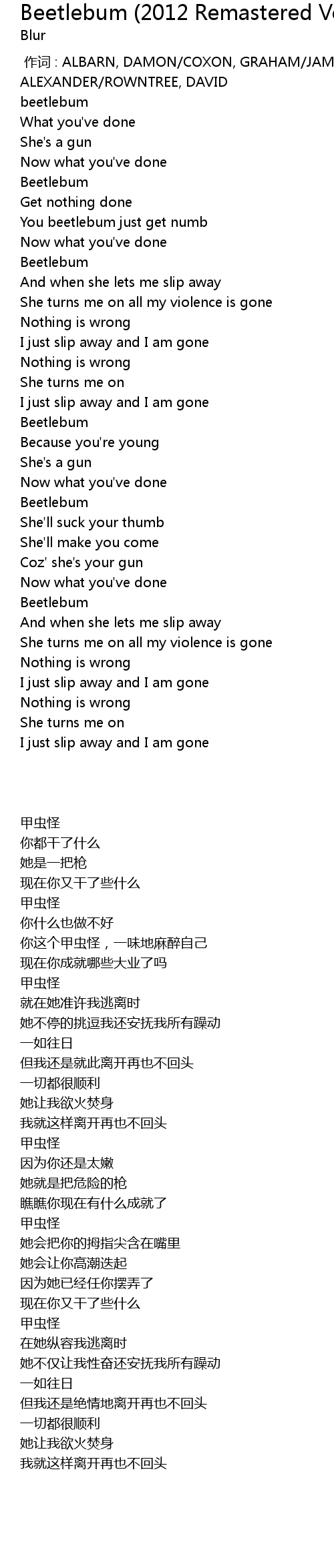 | [00:00.00] | 作词 : ALBARN, DAMON/COXON, GRAHAM/JAMES, STEVEN ALEXANDER/ROWNTREE, DAVID |