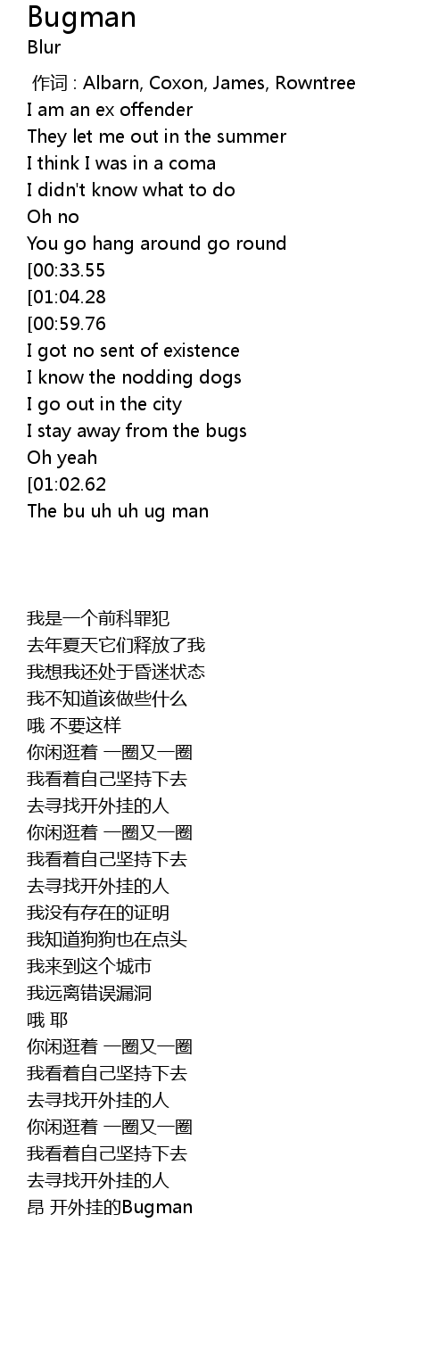 | [01:12.10][01:04.28][00:42.61][00:35.31] | Look out for the Bugman |