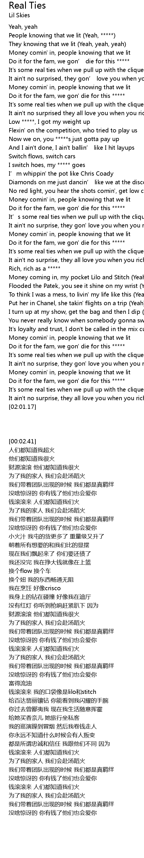 | [01:00.59] | It’s some real ties when we pull up with the clique |