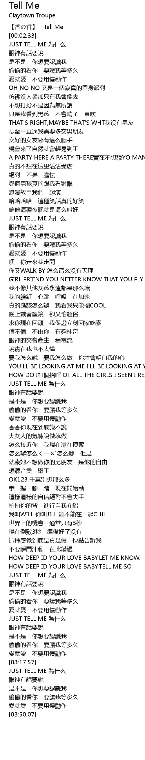| [03:31.72] | JUST TELL ME wèi shén me |