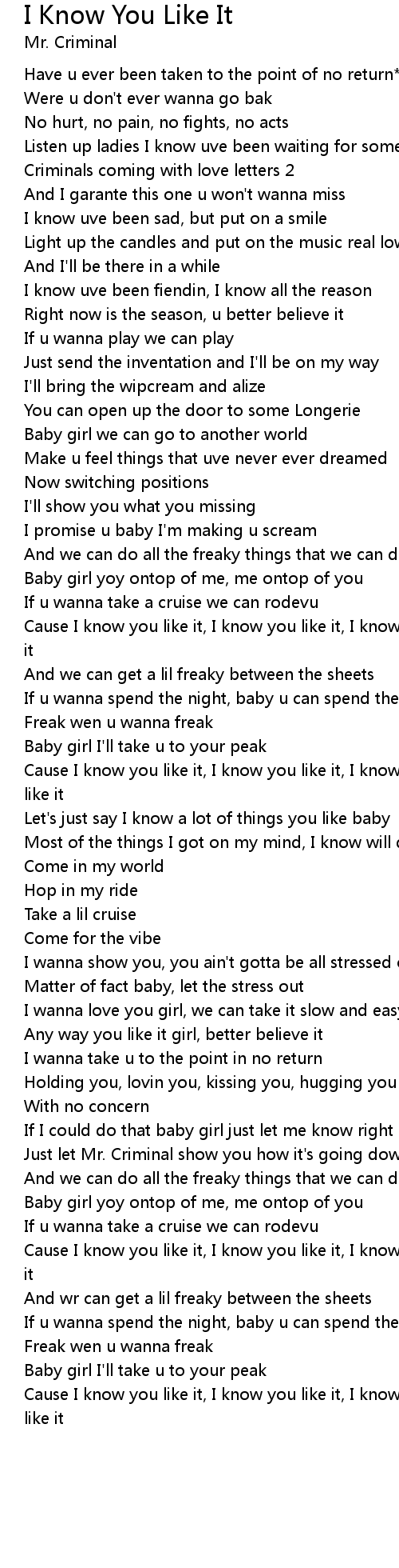 Cause I know you like it, I know you like it, I know you lke it, I know you like it |