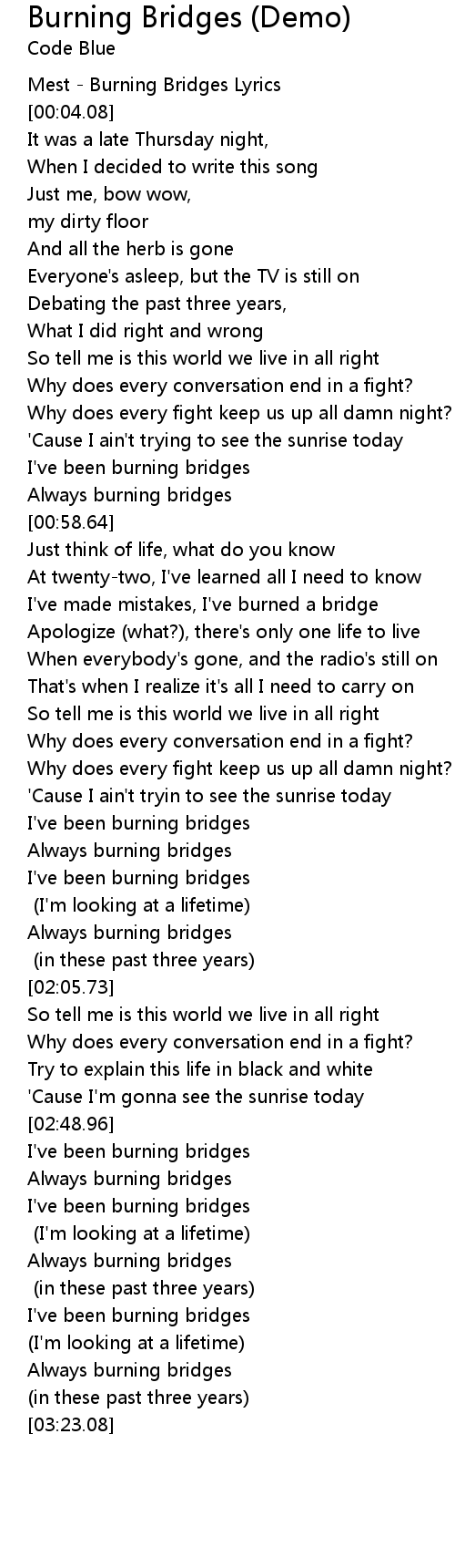 | [00:00.77] | Mest - Burning Bridges Lyrics |