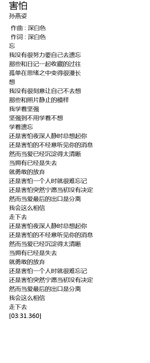 | [02:33.630] | 还是害怕夜深人静时总想起你 |