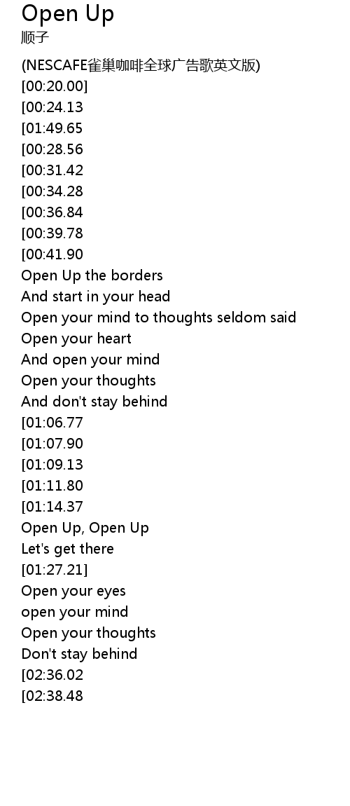 | [02:19.59][01:14.37] | Open Up, Open Up Open Up, Open Up |