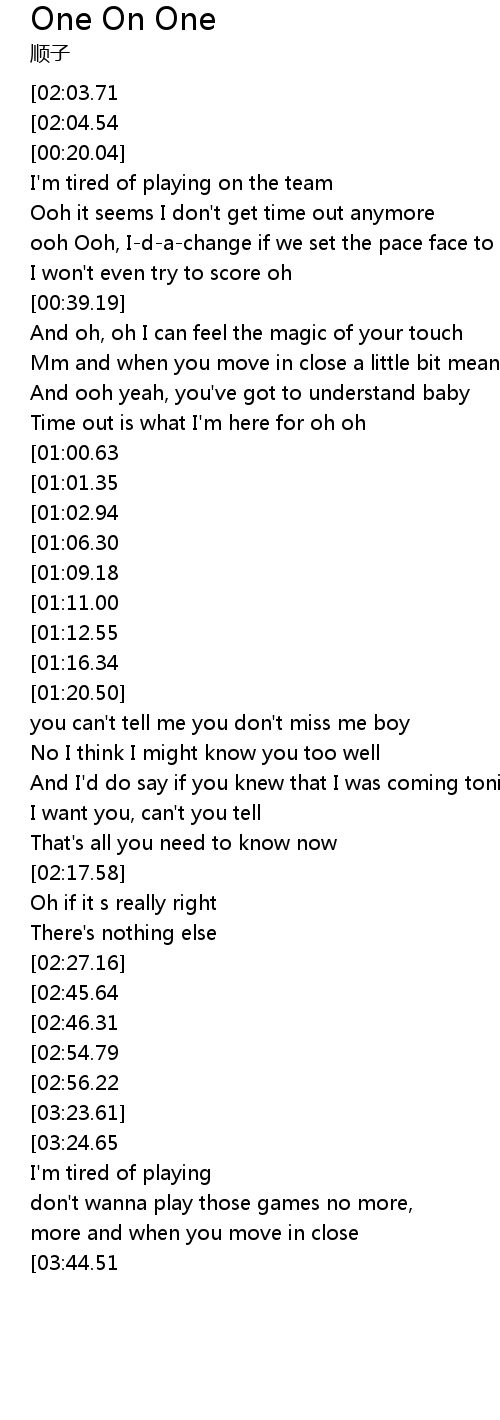 | [01:55.42][01:16.34] | One on one so slow ooh Ooh |