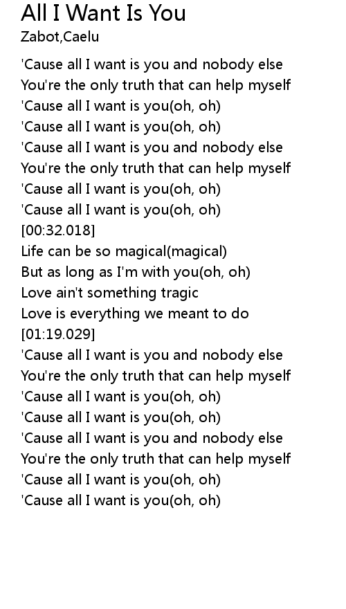 | [00:01.594] | 'Cause all I want is you and nobody else |
