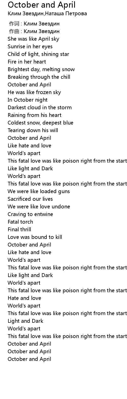 | [01:09.88] | October and April |