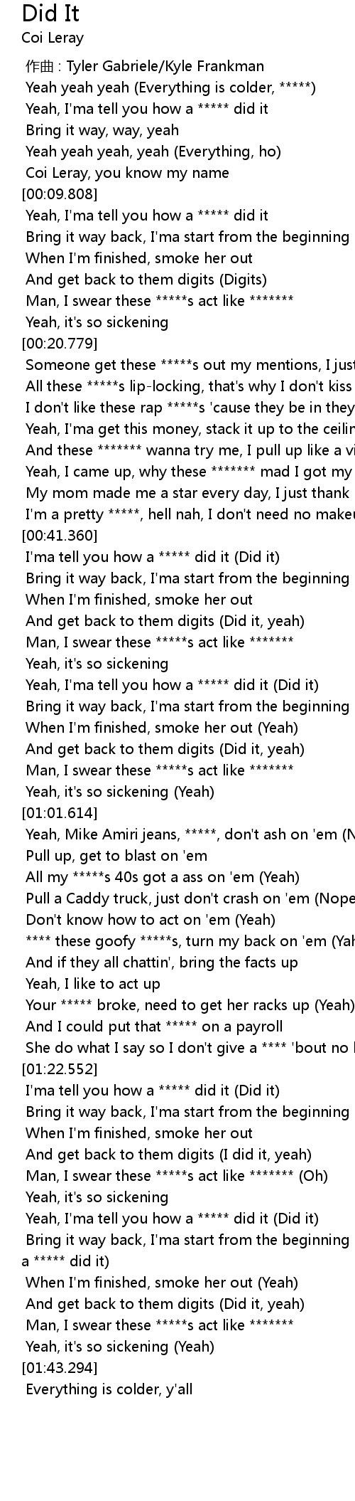 | [01:22.841] | I'ma tell you how a ***** did it (Did it) |