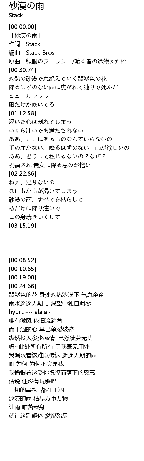 | [00:38.40] | 灼熱の砂漠で息絶えていく翡翠色の花 |