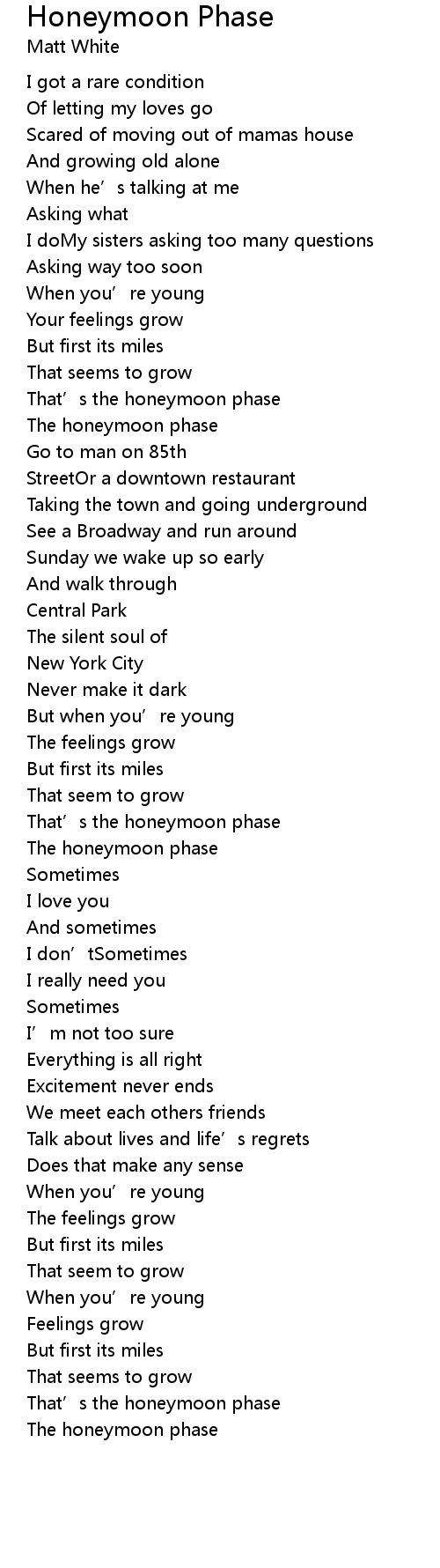 | Song | Honeymoon Phase |