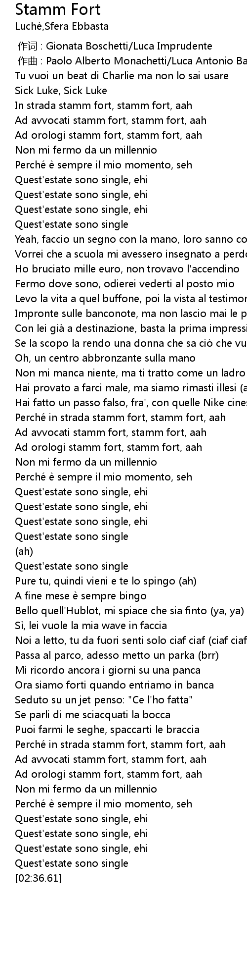 | [02:12.56] | Perche in strada stamm fort, stamm fort, aah |