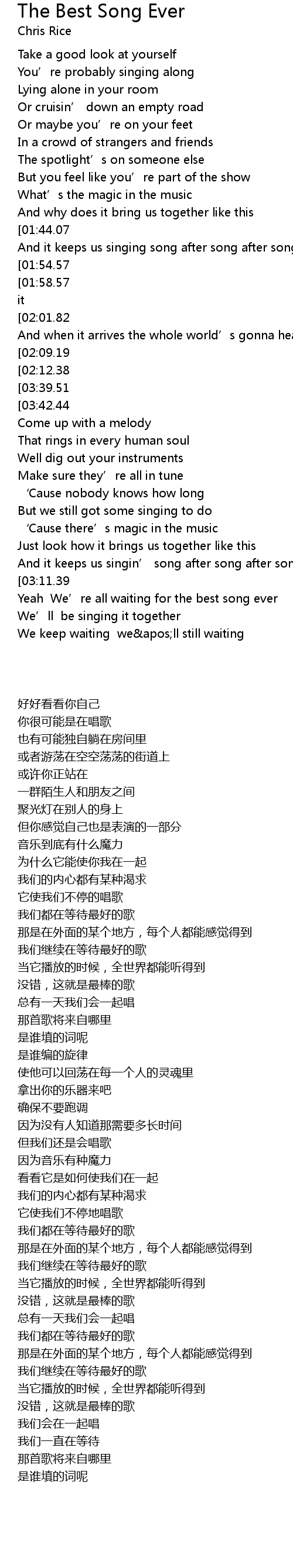 | [00:46.58][01:54.57] | We' re all waiting for the best song ever |