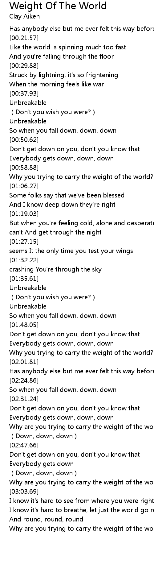 | [02:39.67] | Why are you trying to carry the weight of the world? |