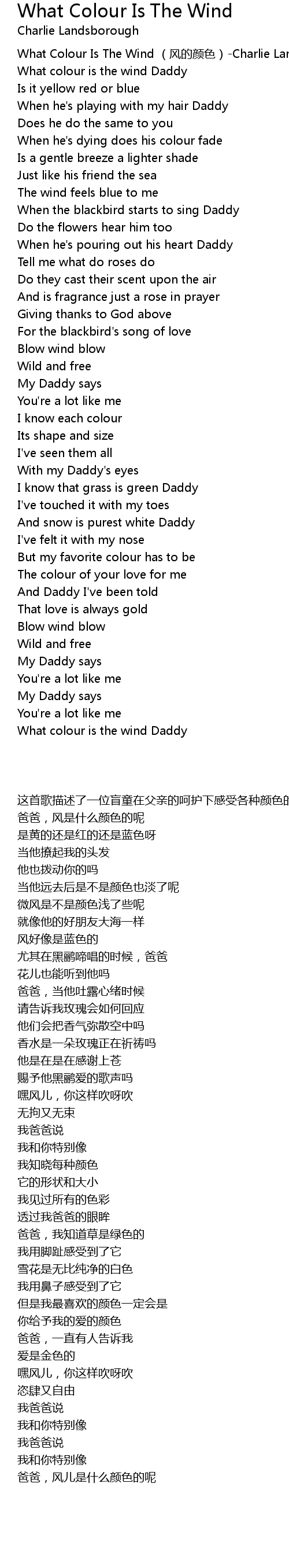 | [00:00.00] | What Colour Is The Wind fēng de yán sè Charlie Landsborough |