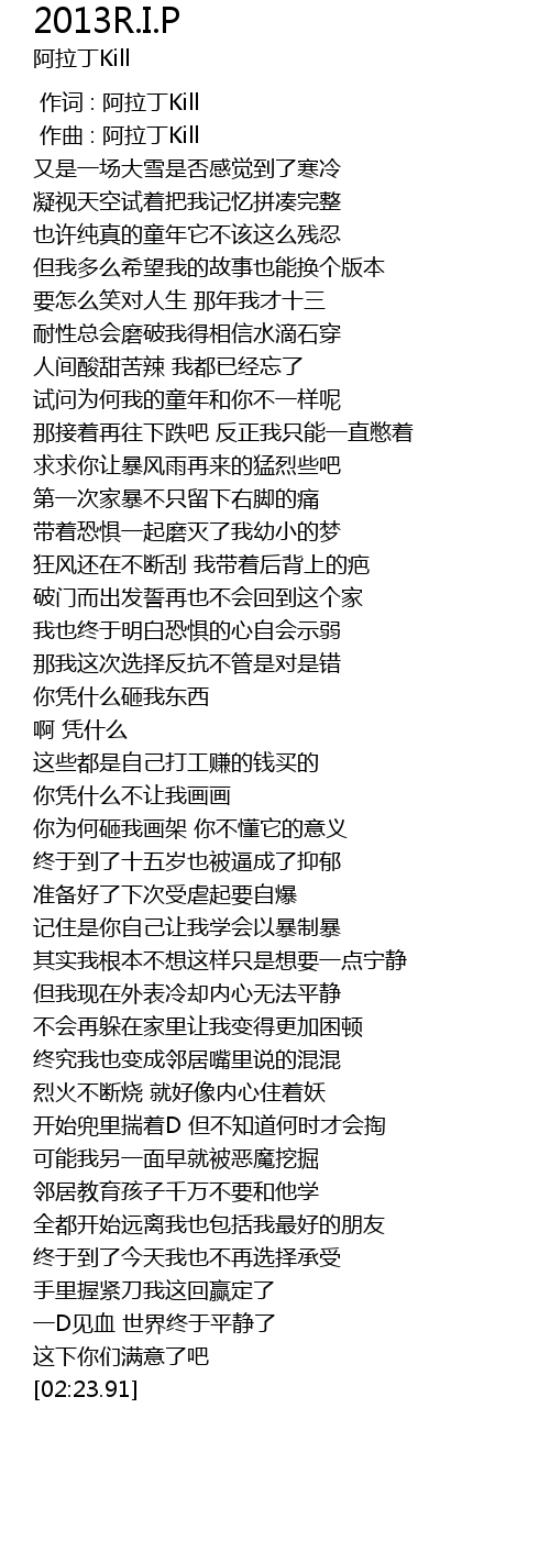 | [00:01.000] | 作曲 : 阿拉丁Kill |